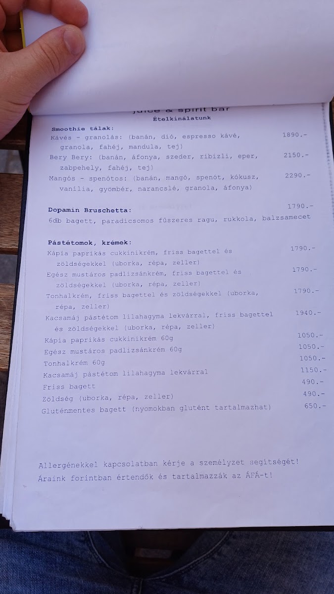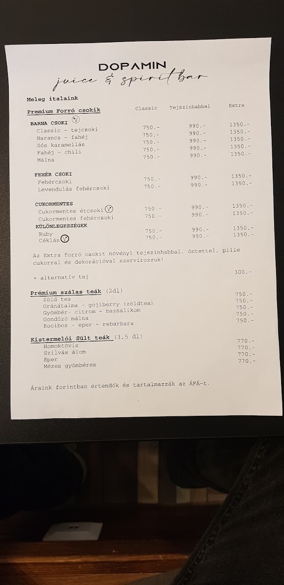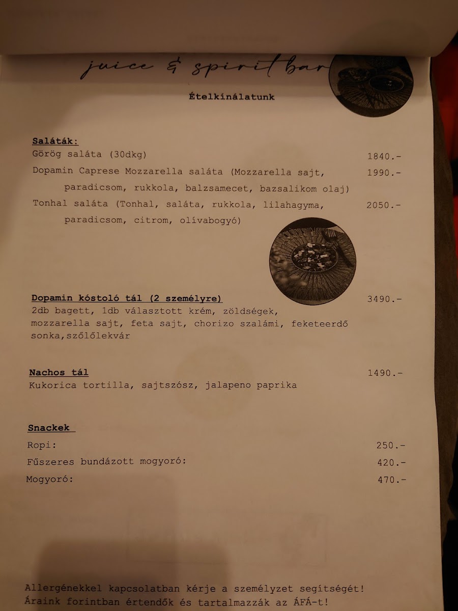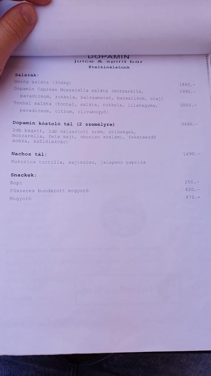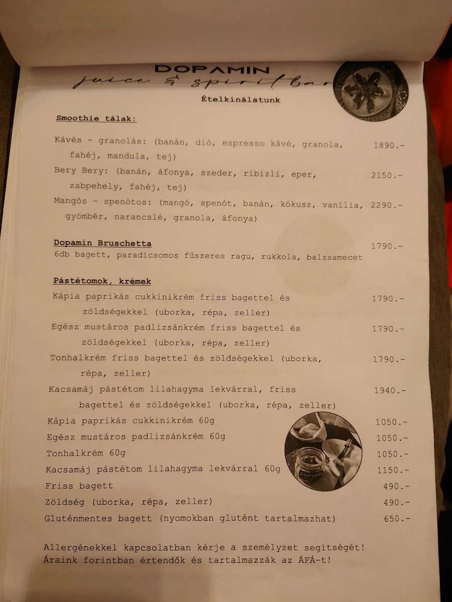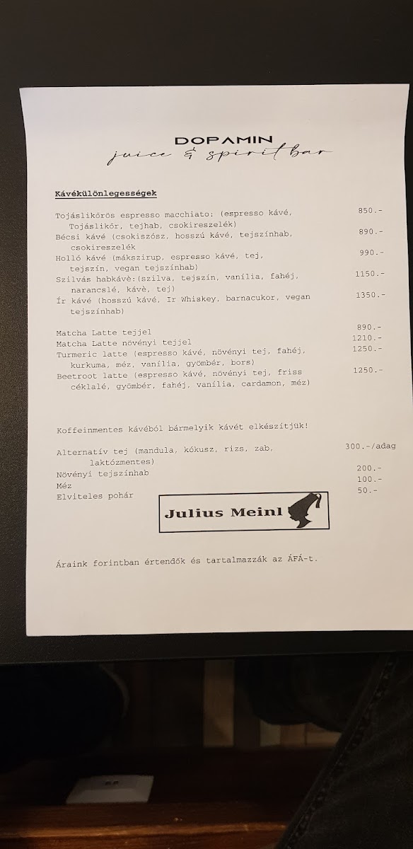 Dopamin Juice & Spirit Bar & Kávézó in Eger offers a menu that strikes a perfect balance between indulgence and health-conscious choices, making it a standout spot for both locals and visitors. The Céklás Smoothie is a vibrant, earthy blend that showcases the freshness of its ingredients while delivering a subtle sweetness that lingers pleasantly on the palate. Equally impressive is the Mangós-Spenotos Smoothie, where the bright, tropical flavor of mango pairs harmoniously with the mild, green notes of spinach, creating a drink that feels both refreshing and nourishing. For those with a sweet tooth, the Fehércsokis Latte is a decadent treat, marrying rich white chocolate with smooth, perfectly steamed milk, offering a comforting yet sophisticated twist on a classic coffee beverage. Each item on the menu reflects careful attention to quality and flavor, with thoughtful combinations that appeal to a variety of tastes. Overall, the menu at Dopamin Juice & Spirit Bar & Kávézó is vibrant, inventive, and satisfying, leaving a memorable impression for anyone seeking a refreshing drink or a cozy coffee experience in the heart of Eger.
